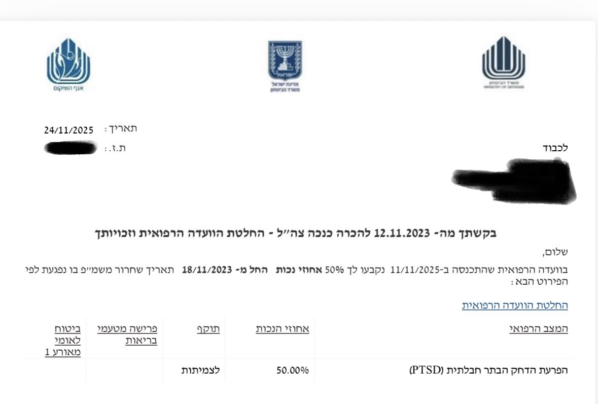 שרד הביטחון- החלטת אגף השיקום מחודש נובמבר 2025 בוועדה רפואית להכיר בחייל שלקה בתסמונת פוסט טראומתית בשיעור 50% עקב אירועים שחווה בתקופת שירותו הצבאי.