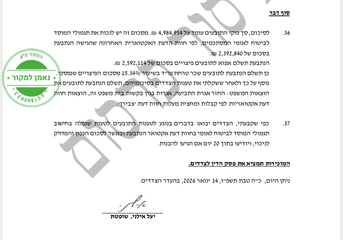 פסק דין שניתן ביום 14.1.26 בביהמ"ש המחוזי בתל אביב, בגינו התקבל פיצוי כולל של 5 מיליון ש"ח , 2.6 מיליון ₪ ישולמו באמצעות חברת הביטוח ו-2.4 מיליון ₪ באמצעות המוסד לביטוח הלאומי, מכיוון שהתאונה הינה תאונת עבודה.